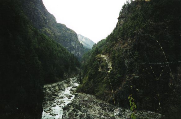Looking along the Bhote Kosi, with the bridge over the Dudh Kosi on the right